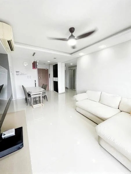This unit features an open-concept layout with a stylish glass-top dining table, complemented by a kitchen boasting striking two-tone cabinetry, a gas hob, and a stainless steel refrigerator. The bedroom is a functional haven, equipped with a built-in floating desk, air conditioning, and a queen-sized bed, ensuring comfort and practicality. Enjoy the convenience of a retractable laundry drying rack and ceiling fans in the living areas, enhancing the overall living experience.