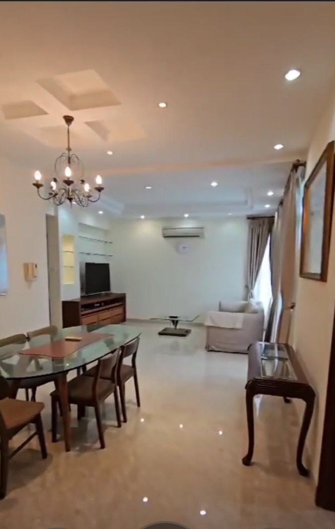 This well-designed unit features a spacious layout with three bedrooms and two bathrooms, perfect for family living. The L-shaped kitchen boasts wooden cabinets, black countertops, and modern appliances, including a built-in oven and dual washing machines in the service yard. The marble-look vanity in the bathroom adds a touch of sophistication, while the utility room provides additional storage space, enhancing the practicality of this home.