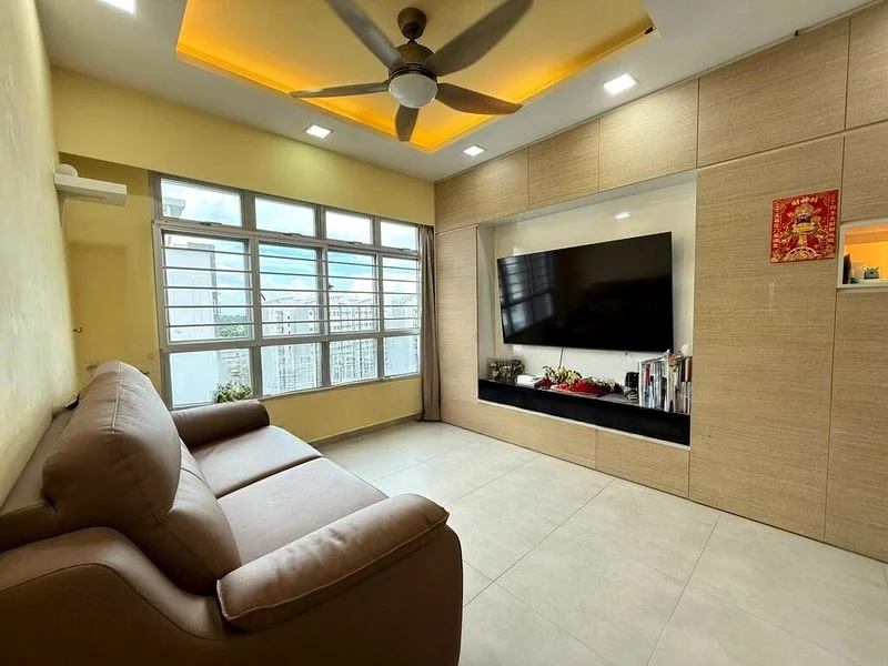 Step into this beautifully renovated HDB flat and be greeted by an abundance of natural light streaming through large windows, illuminating the full-height wood-grain feature wall in the living room. The modern ambiance is enhanced by cove lighting and a spacious layout that invites relaxation and comfort, while the views of the landscaped courtyard and children's playground create a serene backdrop for everyday living.
