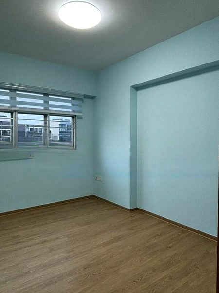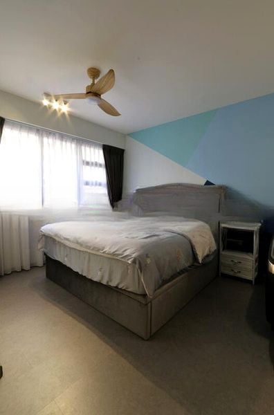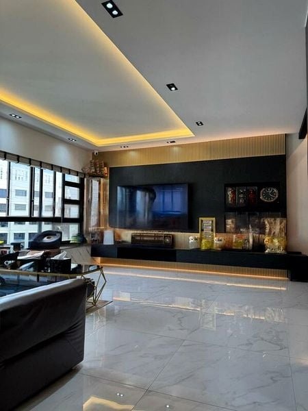 Step into a world of modern elegance as you enter this beautifully designed HDB flat. The abundant natural light floods the space, highlighting the exquisite finishes, including arched rattan cabinet doors and a striking geometric blue accent wall. The ambiance is both inviting and sophisticated, complemented by a modern gold chandelier that adds a touch of luxury to the dining area.