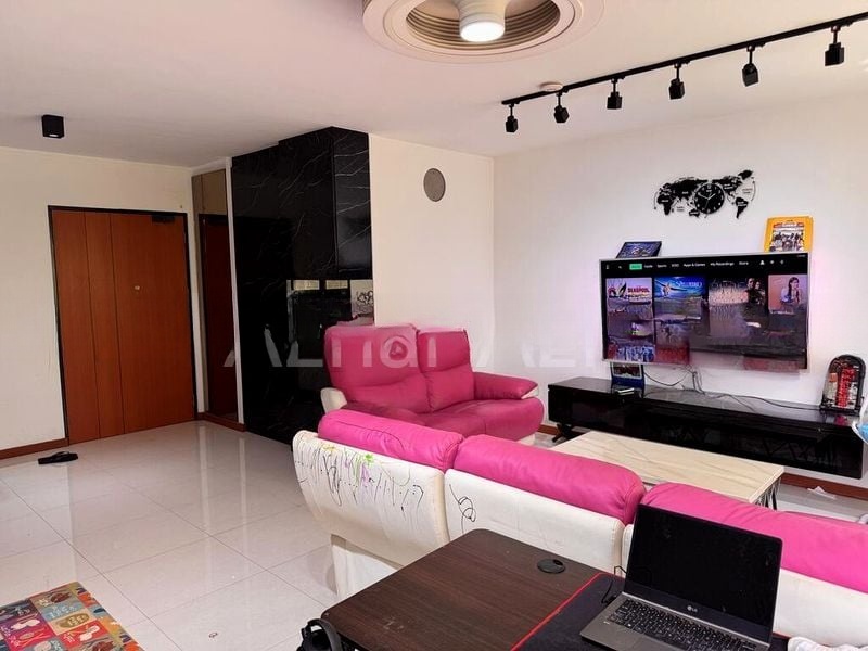 This well-maintained, fully-furnished unit boasts an efficient 3-bedroom layout, featuring custom pink high-gloss wardrobes in the master bedroom and an integrated vanity area that adds a touch of luxury. The open-concept study area within the living room is perfect for remote work, while the colorful floor mat adds a playful element. With a household shelter and a kitchen designed for functionality, this home is both stylish and practical.