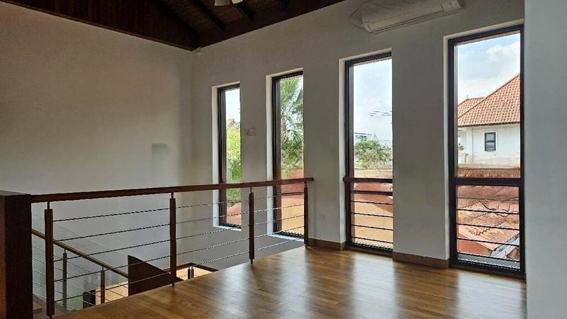Step into a world of elegance as you enter this stunning home, where abundant natural light floods the space, creating a bright and airy ambiance. The polished stone flooring in the living room complements the large sliding glass doors that provide direct access to your private pool, while the modern wooden staircase with wire railings adds a touch of sophistication. Enjoy picturesque views of the pool and lush greenery from every angle.