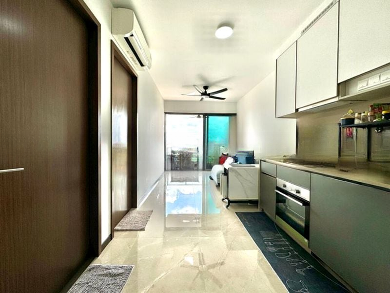 This spacious 4-bedroom unit features an integrated study area, perfect for work-from-home arrangements, and built-in wardrobes that maximize storage. The modern bathroom boasts marble-look wall tiles and a glass shower partition, while each room is equipped with ceiling fans and air conditioning for comfort. Enjoy the extensive pool facilities and landscaped gardens right at your doorstep, enhancing your living experience.