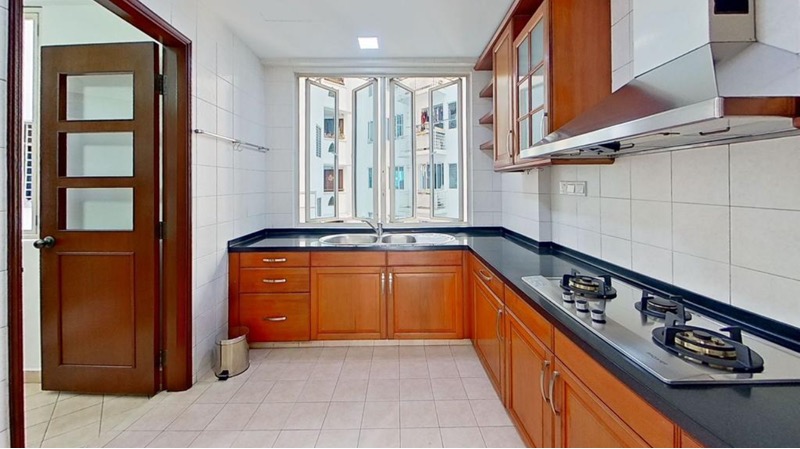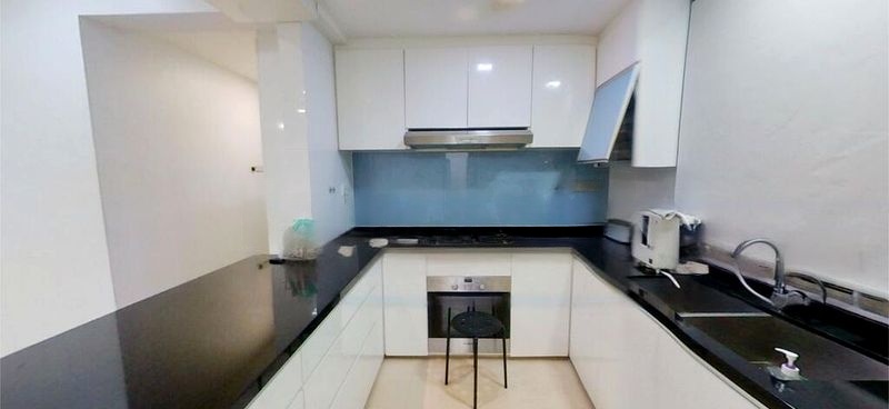 This well-maintained 3-bedroom unit features a thoughtful layout with a master bedroom that boasts wood-paneled walls, built-in floor-to-ceiling wardrobes, and direct access to a private balcony. The dining area is perfect for gatherings, adorned with a large wall mirror and pendant lighting, while the kitchen is equipped with modern appliances, including a built-in oven and stylish mosaic tile backsplash. Each bedroom is fitted with parquet flooring and ample storage, ensuring comfort and functionality.