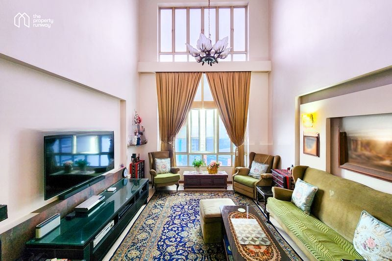 Step into a warm and inviting atmosphere where abundant natural light floods through double-volume windows, highlighting the high ceilings of the spacious living room. The elegant chandelier and ornate rug create a cozy ambiance, while the vibrant pink kitchen cabinetry adds a unique touch to the heart of the home. Enjoy sweeping urban views that elevate your living experience.