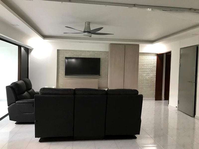 Step into a world of modern elegance as you enter this beautifully renovated HDB flat, where urban views meet a bold design aesthetic. The spacious living room welcomes you with a striking dark feature wall, a plush red tufted sofa, and a stunning crystal chandelier that casts a warm glow across the white tiled flooring. Large balcony access invites natural light, enhancing the vibrant ambiance of the space.