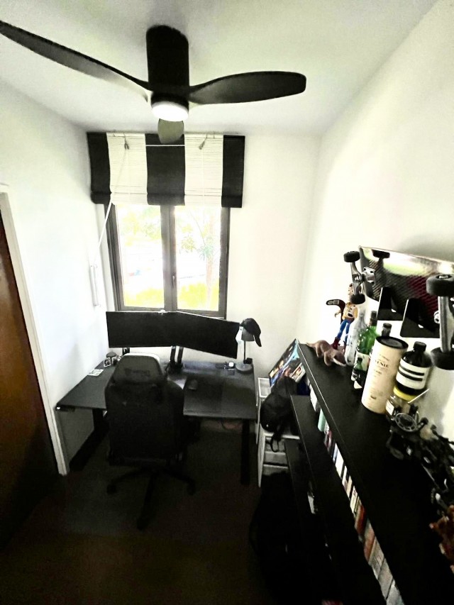 This thoughtfully designed unit features a modern kitchen with an island counter, built-in oven, and overhead air-conditioning, making it a chef's delight. The master bedroom offers a cozy retreat with its large windows, accommodating a queen-sized bed and a dedicated TV console area. Each common bedroom is equipped with built-in wardrobes and ample space, while the study area is perfect for work or leisure. The stylish bathroom boasts a vanity with an integrated sink and a large mirror, ensuring functionality and style.