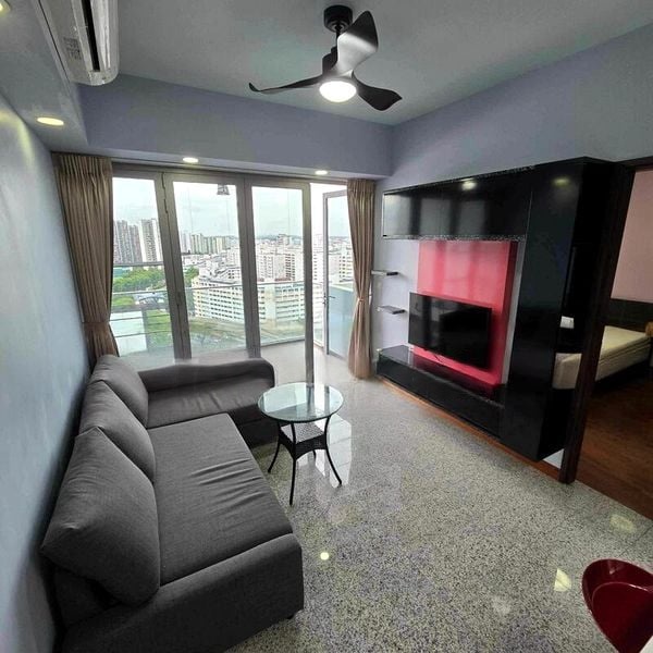 Step into this beautifully renovated 1-bedroom unit at Hillsta and be greeted by an abundance of natural light streaming through large windows, illuminating the modern finishes and vibrant accent walls. The living room features a stylish L-shaped sofa and a striking red accent wall, seamlessly connecting to a balcony that offers stunning urban views, perfect for unwinding after a long day.