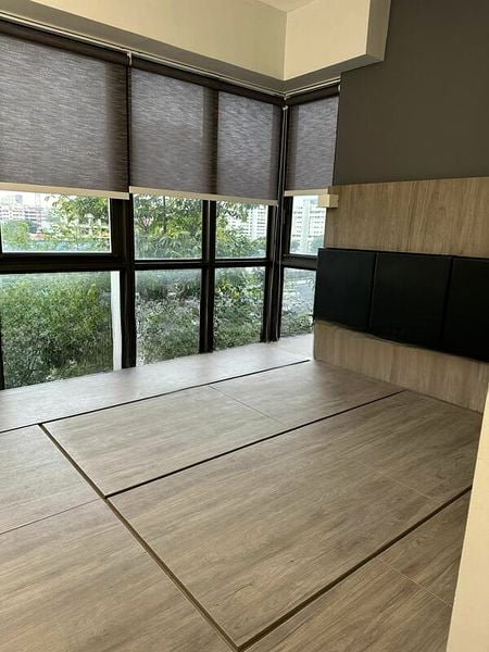 Step into a modern minimalist haven at Sims Urban Oasis, where natural light dances across polished floor tiles and highlights the designer finishes throughout. The ambiance is inviting, with large windows framing serene greenery views, creating a tranquil escape from the bustling city.