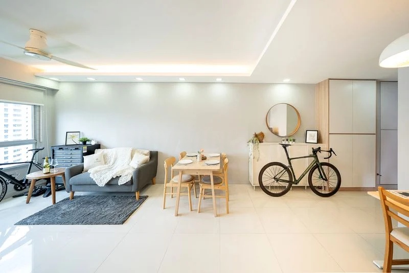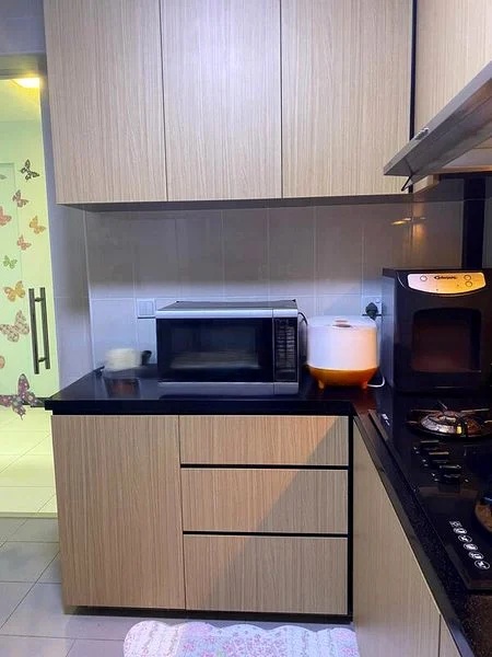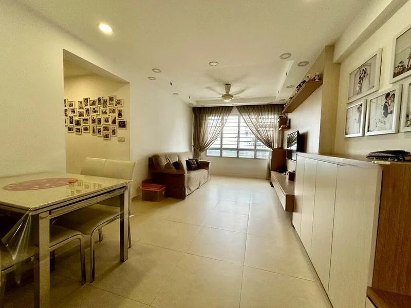 Step into this beautifully renovated HDB flat and be greeted by an ambiance of modern minimalism. The open-concept living and dining area is bathed in natural light, accentuated by large windows and recessed lighting that create a warm and inviting atmosphere. The sleek black stone kitchen countertops and stylish dual-tone cabinetry promise both functionality and elegance, making it a perfect space for culinary enthusiasts.