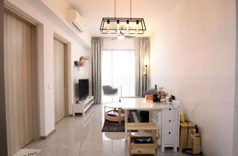 Step into this beautifully renovated 1-bedroom unit at Sengkang Grand Residences, where modern minimalist design meets comfort. The marble-look floor tiles glisten under natural light, creating an inviting ambiance that flows seamlessly from the open-concept living room to the balcony, offering serene views of lush greenery and neighboring buildings.