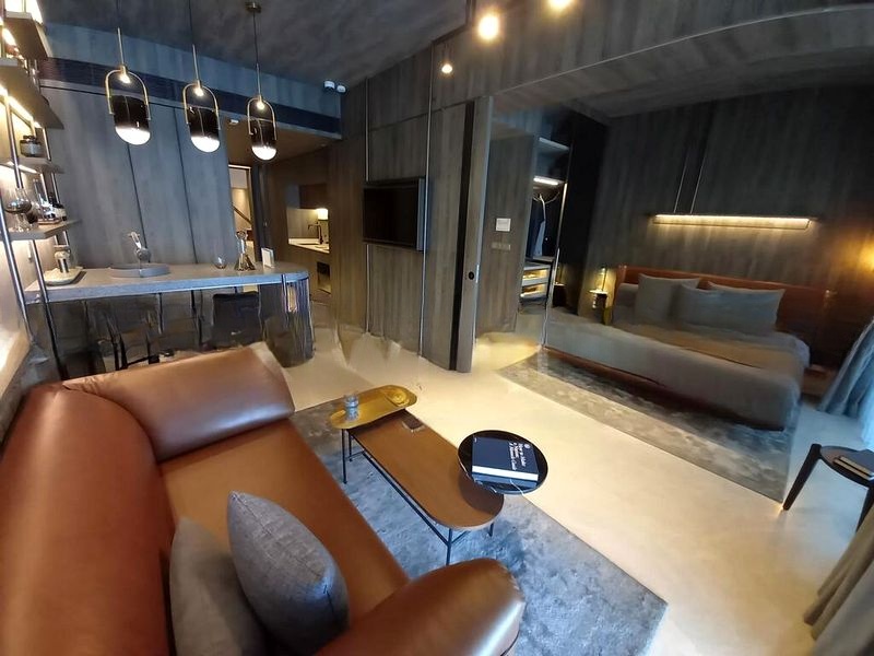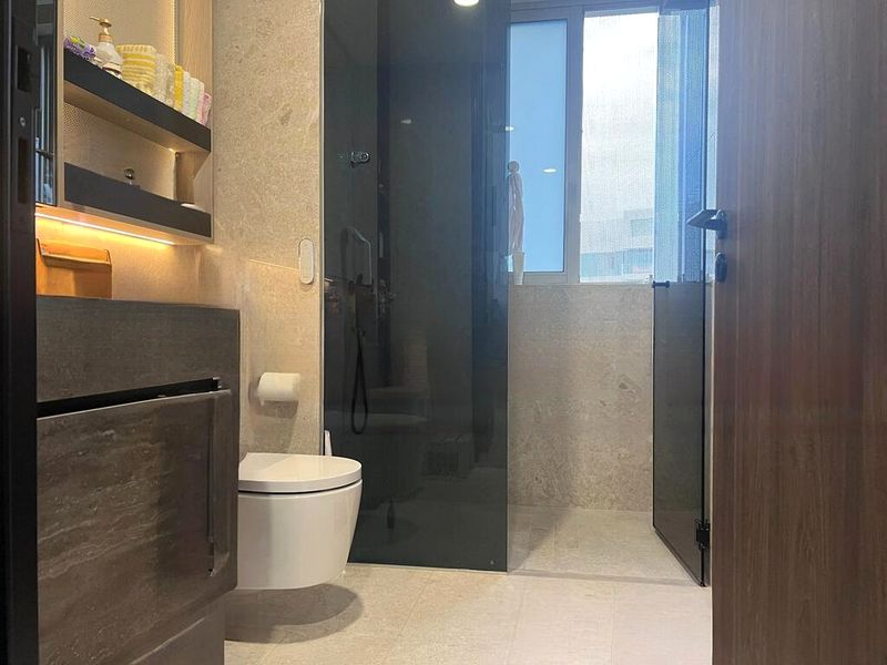 This efficient 2-bedroom, 2-bathroom layout spans 883 sqft and features an open-plan dining area that seamlessly connects to the balcony. The en-suite master bathroom boasts a wall-hung toilet, marble-effect wall tiles, and a dark tinted glass shower partition, complemented by recessed shelving with LED lighting for a touch of elegance. Each room is designed to maximize comfort and style, ensuring a luxurious living experience.