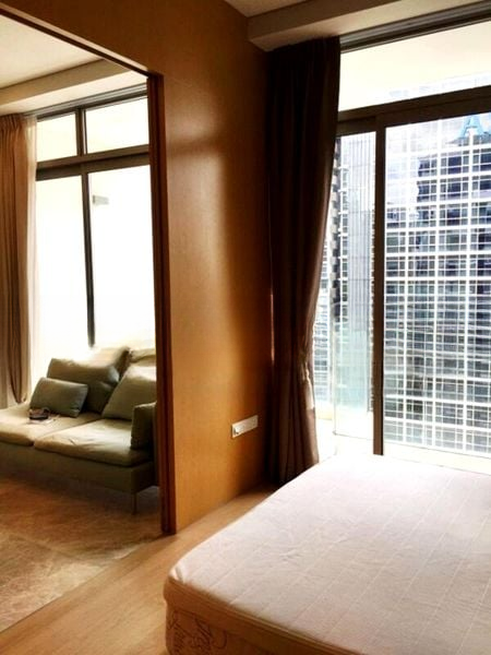 This efficient 1-bedroom layout features an open-concept living and dining area seamlessly integrated with a minimalist kitchen, complete with built-in oven and sleek white cabinetry. The bedroom, separated by a flexible sliding door partition, offers a cozy retreat with wooden flooring and large windows that invite in more light. Perfect for modern living, this unit is fully furnished and ready for you to move in.