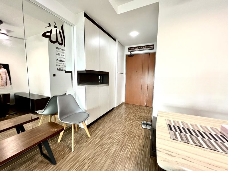 Step into this beautifully renovated 3-bedroom flat at 467B Fernvale Link, where modern elegance meets functionality. The entryway greets you with a large mirror adorned with Arabic calligraphy, complemented by built-in cabinets that create an inviting ambiance. Natural light filters through large windows, illuminating the wood-look laminate flooring that flows seamlessly throughout the unit.