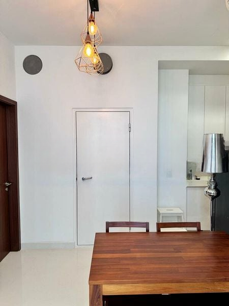 This well-maintained 1-bedroom unit features a thoughtful layout that maximizes space and functionality. The living area is furnished with a comfortable sofa bed and a stylish TV console, while the dining area boasts designer pendant lights above a wooden dining set. The bathroom is a true retreat, complete with a glass shower enclosure and a rain shower, complemented by a vessel sink and dark accent wall. The loft area, accessed by elegant wooden stairs, offers additional storage with a mirrored sliding wardrobe and recessed ceiling lights.
