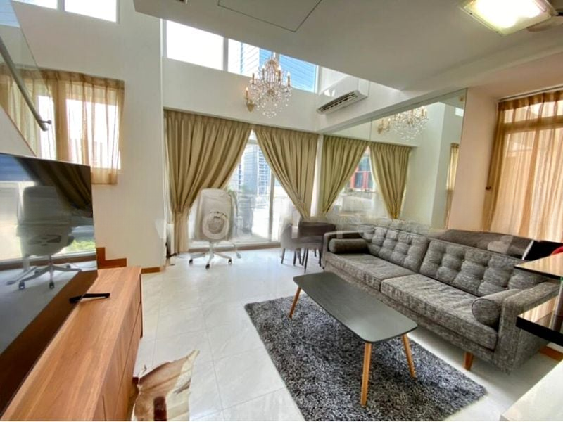 Step into a bright and airy sanctuary where abundant natural light floods through large windows, illuminating the elegant living space adorned with a striking crystal chandelier. The double-volume high ceiling creates an expansive feel, while the stylish grey tufted sofa invites relaxation against a backdrop of the stunning city skyline.
