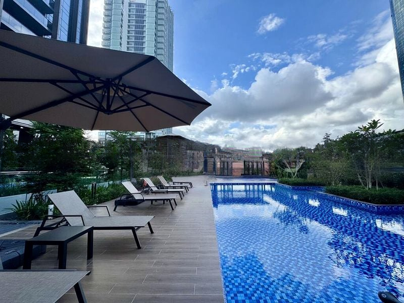 Step into a world of elegance and sophistication at Pullman Residences Newton, where abundant natural light floods the open-concept living space through floor-to-ceiling windows, framing breathtaking views of the city skyline, lush greenery, and the inviting lap pool. The modern minimalist design, accentuated by marble flooring and sleek finishes, creates an ambiance that is both tranquil and inspiring.