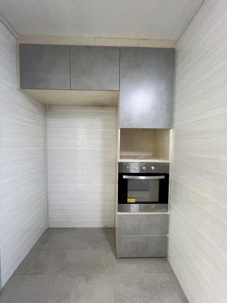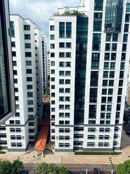 Step into a bright and airy sanctuary where the charm of terrazzo flooring greets you at every turn. The high floor position offers unblocked views of the greenery and cityscape, filling the space with natural light and a sense of openness. The living room, adorned with a comfortable sofa set and a TV console, invites relaxation, while the hallway features a stylish blue door frame that adds character to the entrance.