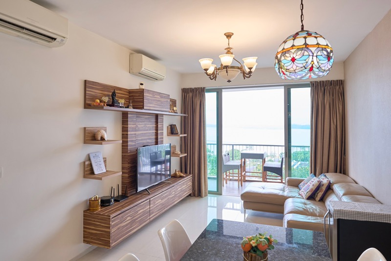 Step into a bright and airy sanctuary at Ripple Bay, where floor-to-ceiling windows invite abundant natural light and showcase stunning views of the sea and lush greenery. The polished floor tiles and sliding glass doors create an inviting ambiance, while the spacious balcony offers an ideal spot to unwind and soak in the unobstructed vistas.