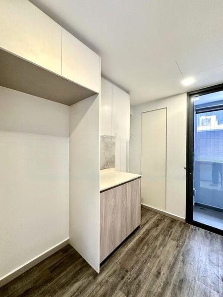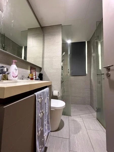 This well-maintained 3-bedroom unit features light wood flooring and a light grey accent wall in the master bedroom, complemented by a built-in sliding wardrobe and track lighting. The bathrooms boast a contemporary design with a glass shower enclosure and modern vanity, ensuring both style and functionality. The open layout maximizes space, making it ideal for both entertaining and everyday living.