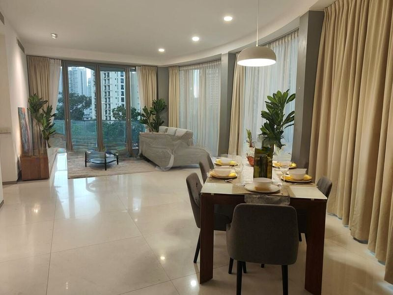 Step into a world of luxury as you enter this stunning 4-bedroom penthouse at Cliveden at Grange. The double-height ceiling and floor-to-ceiling curved windows bathe the living room in abundant natural light, creating a bright and airy ambiance. An ornate chandelier adds a touch of elegance, while panoramic views of the city skyline and lush greenery invite you to unwind in style.