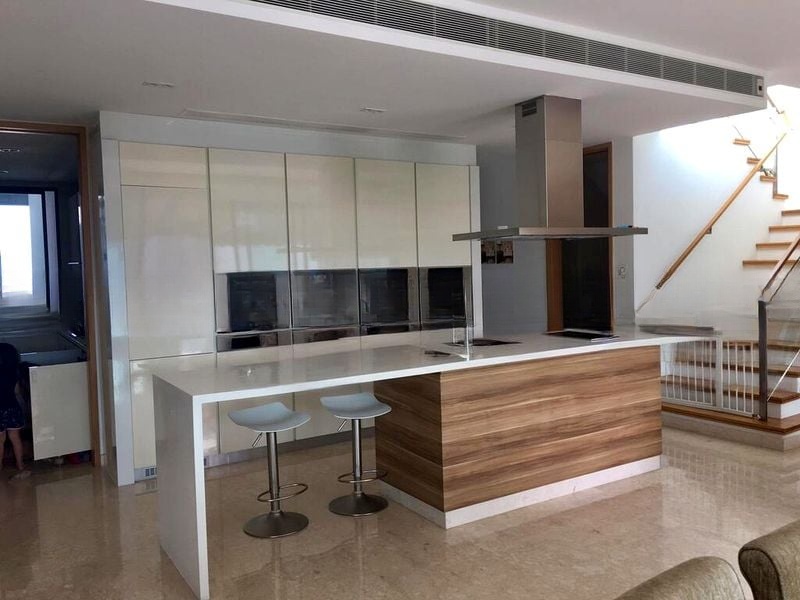 This well-maintained 4-bedroom unit boasts an open-concept layout, featuring a stylish island kitchen with a breakfast bar and integrated appliances, perfect for culinary enthusiasts. The dining area, adorned with polished marble flooring and sliding glass doors, seamlessly connects to a large balcony with a retractable awning, offering panoramic views of the pool and urban landscape. The living room showcases a full-height wooden feature wall and built-in shelving, creating a sophisticated focal point.