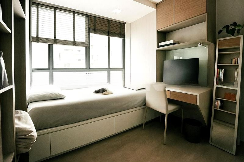 This well-maintained 3-bedroom, 3-bathroom unit boasts standout features such as a built-in platform bed with storage drawers, an integrated study desk, and a galley kitchen equipped with built-in appliances. The master bedroom features a mirrored wall that enhances the sense of space, while the second bedroom is thoughtfully designed with a built-in single bed and custom shelving, perfect for maximizing functionality.