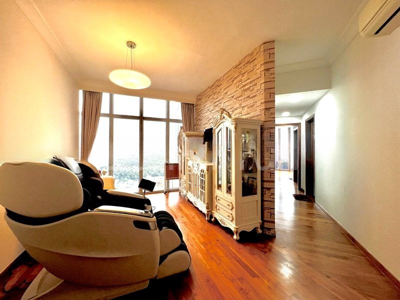 Step into a world of elegance as you enter this beautifully renovated unit at The Bayshore. Bathed in natural light, the spacious living area features floor-to-ceiling windows that frame serene greenery views, creating a cozy and warm ambiance. The faux-brick feature wall and ornate display cabinets add a touch of classic charm, inviting you to unwind in style.