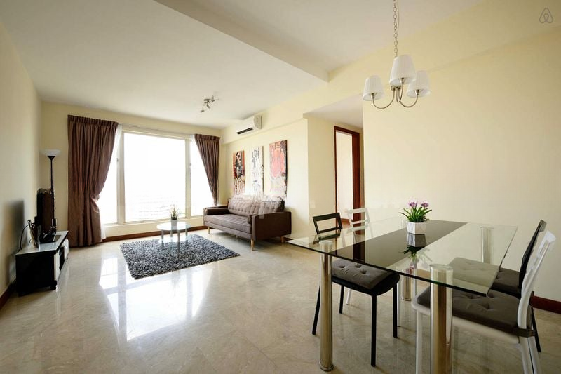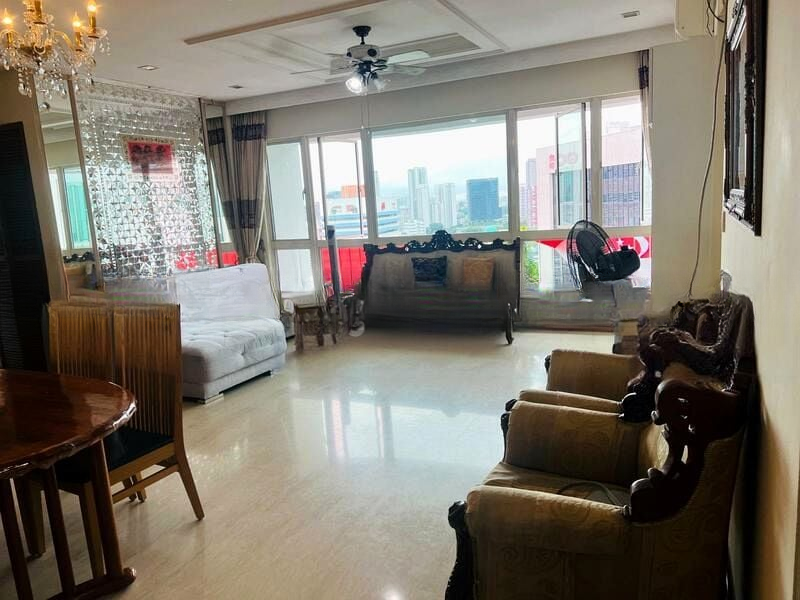 This well-designed layout features a spacious living room with an L-shaped sofa and mirrored wall partitions that enhance the sense of space. The dining area, adorned with a wooden dining set and a hanging egg chair, is perfect for entertaining. The galley kitchen is equipped with modern conveniences, including an integrated washing machine, dark countertops, and ample storage. Each bedroom boasts ceiling fans and stunning views, ensuring comfort and style throughout.