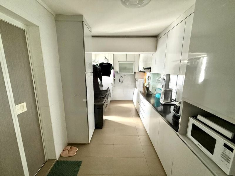This well-maintained 5-room flat features a galley kitchen adorned with sleek black stone countertops and glossy white cabinetry, perfect for culinary enthusiasts. The master bedroom boasts floor-to-ceiling built-in wardrobes and large windows that invite the urban landscape indoors. An ornate crystal chandelier in the hallway adds a touch of sophistication, while the efficient layout includes three bedrooms, a master ensuite, and a dedicated store room, ensuring ample space for comfortable living.