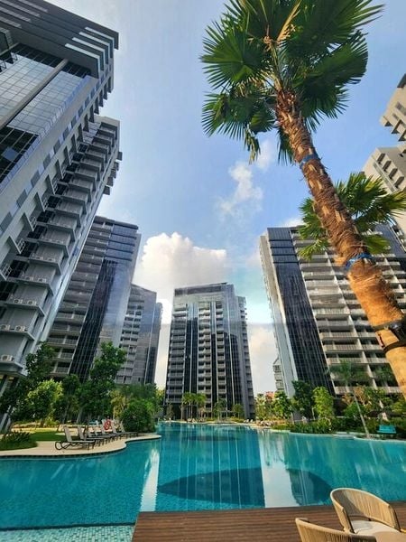 Step into a serene oasis of modern minimalism at The Florence Residences, where polished light grey floor tiles and minimalist white walls create an inviting ambiance. The large black-framed windows invite natural light, framing urban views that enhance the contemporary feel of this well-maintained unit.
