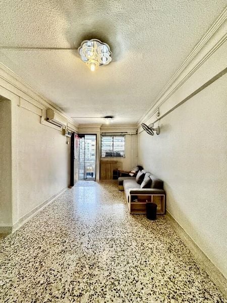 Step into this inviting 2-bedroom flat, where classic terrazzo flooring greets you, exuding a sense of nostalgia and warmth. The long rectangular living room, bathed in moderate natural light, offers a simple yet functional ambiance, perfect for relaxation or entertaining. The arched doorway adds a touch of character, while the views of neighboring residential blocks create a cozy community feel.