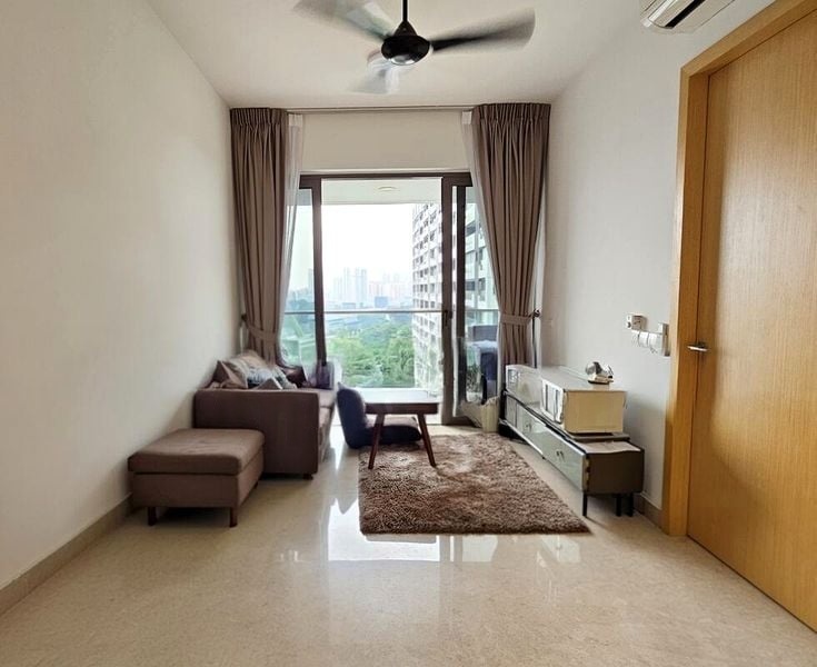 Step into a sanctuary of modern minimalism where natural light dances across the open-concept living space. The well-maintained unit features sleek tiled flooring, track lighting, and a seamless flow to the balcony, inviting you to unwind amidst lush greenery views.