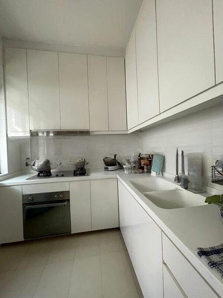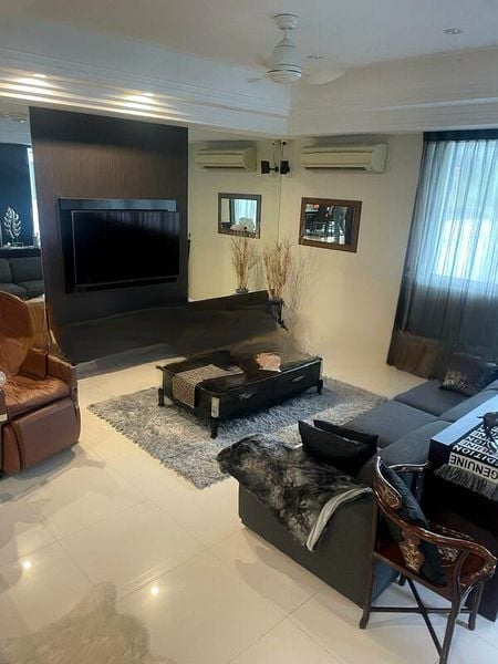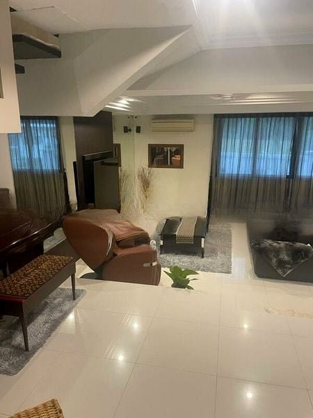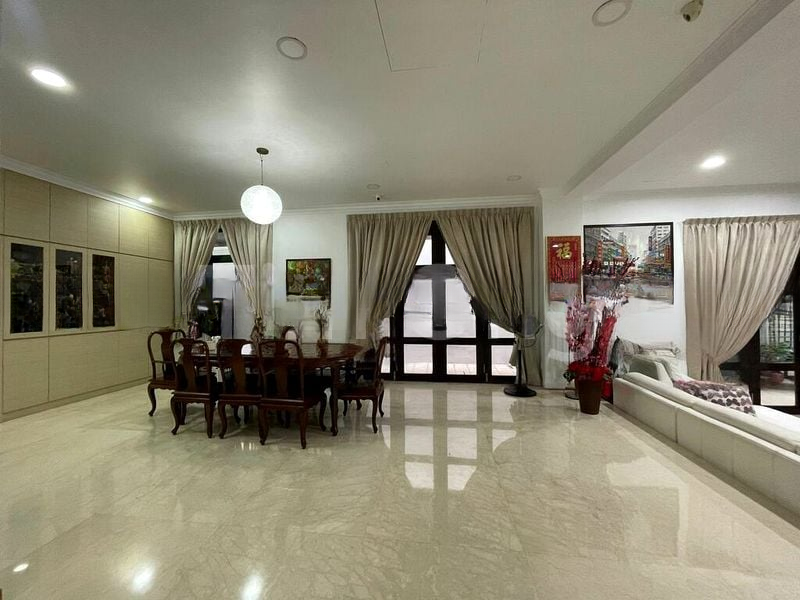 Step into a world of tranquility as you enter this beautifully renovated home, where abundant natural light floods the spacious open-plan living area. The polished marble flooring reflects the warmth of the sun, while large windows framed by elegant beige curtains offer serene views of lush greenery and neighbouring residential buildings. The ambiance is bright and airy, creating a welcoming atmosphere for family and friends.