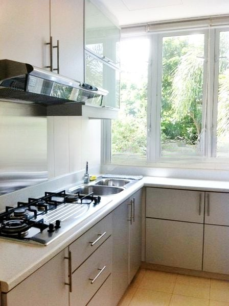 This well-maintained 2-bedroom unit features a thoughtful layout with standout elements such as a fully-equipped L-shaped kitchen, complete with a gas hob and stainless steel backsplash, perfect for culinary enthusiasts. The bedrooms are adorned with parquet wood flooring and large windows, ensuring a serene retreat with views of the surrounding greenery. Enjoy the convenience of two bathrooms, enhancing the comfort for family and guests alike.