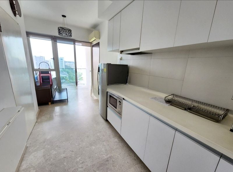 Step into a bright and airy sanctuary where abundant natural light floods the space, accentuating the sleek finishes and inviting ambiance. The living room seamlessly connects to a glass-railed balcony, offering stunning views of the city skyline and lush greenery, creating a perfect backdrop for relaxation.