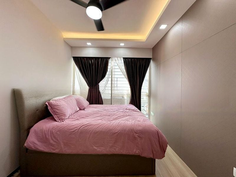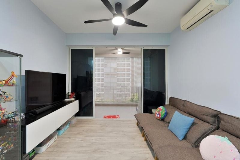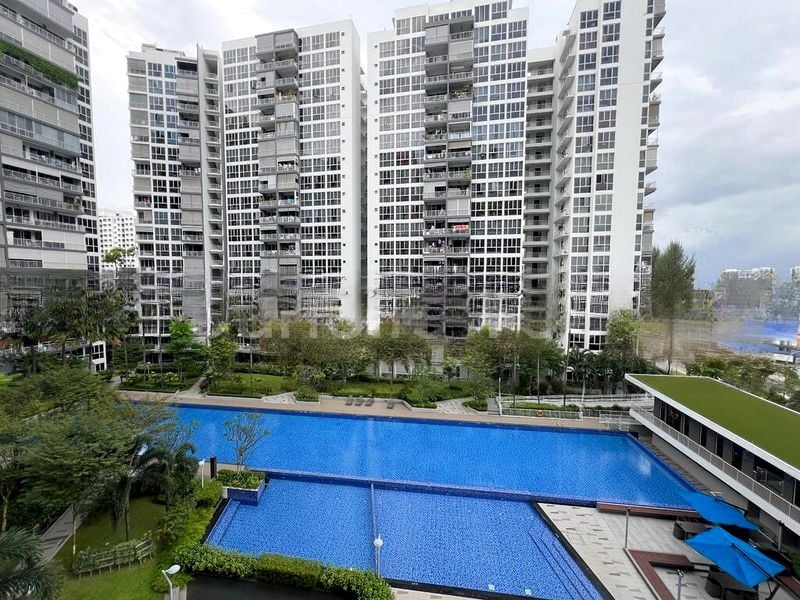 This well-maintained unit features a thoughtful layout with three spacious bedrooms, including a master suite adorned with a blue accent wall and built-in overhead storage. The bathrooms boast elegant glass shower enclosures and stylish wooden vanities, while the balcony, with its artificial turf flooring and invisible grilles, offers a safe and relaxing spot to enjoy the stunning pool view.