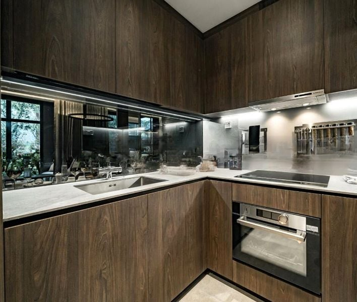 Step into a world of modern luxury as you enter this brand-new designer unit at Midtown Modern. Bathed in natural light, the open-concept living space features exquisite marble-look flooring and a striking marble feature wall that draws the eye. The seamless integration of glass partitions enhances the spacious ambiance, while the lush greenery views create a serene backdrop for everyday living.