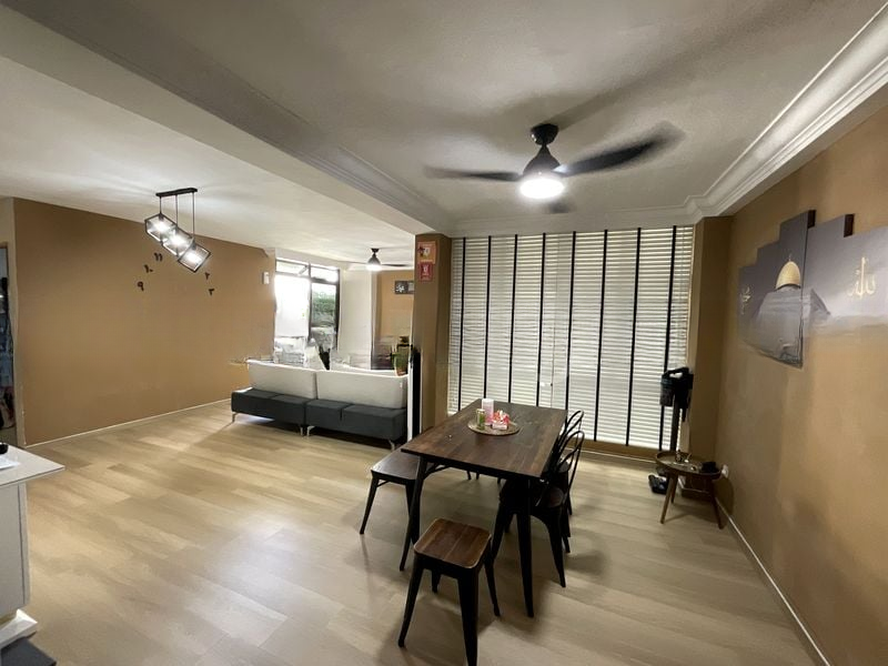 This well-maintained 4-bedroom unit features standout elements such as built-in wooden louvered cabinets and a full-height mirrored wardrobe, enhancing both functionality and aesthetics. Each room is thoughtfully designed, with ceiling fans for added comfort, and a dedicated study/media room equipped with a wall-mounted large screen TV. The dining area seamlessly connects to the living space, making it ideal for entertaining.