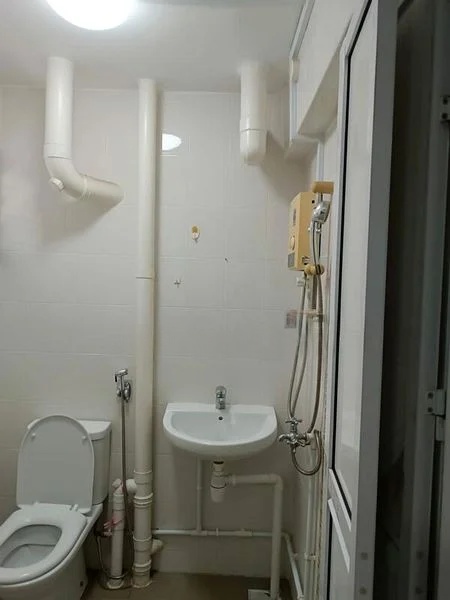 This unit features a functional layout, with a cozy living area equipped with a dark-colored sofa and a study desk, perfect for both relaxation and productivity. The bedrooms are furnished with a single bed and a stylish dark wood wardrobe, ensuring ample storage space. Enjoy the comfort of air conditioning and a ceiling fan with integrated light, enhancing the living experience in this basic yet inviting home.