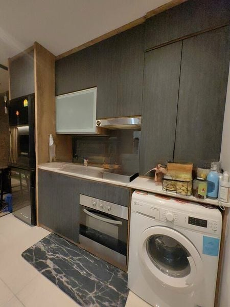 Step into a world of modern elegance as you enter this well-maintained 1-bedroom unit at REZI 26. The inviting ambiance is accentuated by stunning stone feature walls and a striking globe chandelier that casts a warm glow throughout the space. Although natural light is limited, the cozy atmosphere is perfect for relaxation, while the glass sliding doors lead you to a charming balcony adorned with grey stone cladding and a decorative vase.