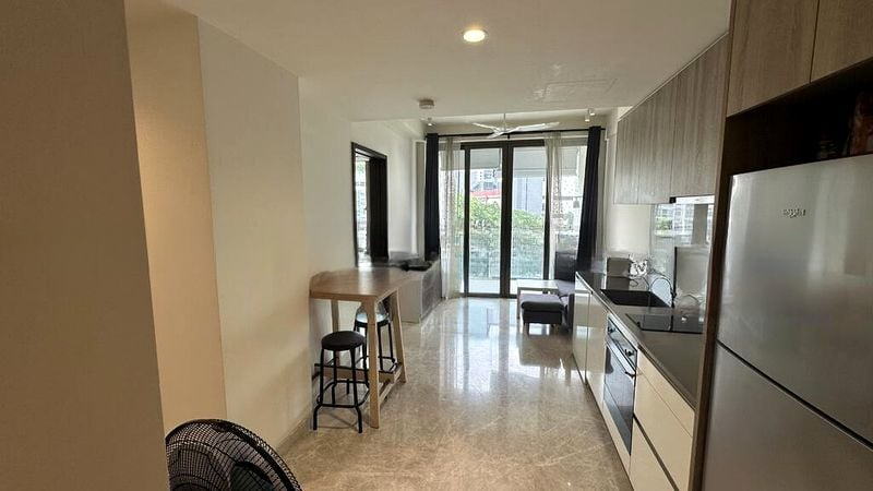 This well-maintained unit features a linear kitchen equipped with integrated appliances, complemented by stylish wood-grain upper cabinets and under-cabinet lighting. The spacious bedroom boasts floor-to-ceiling windows and a built-in sliding wardrobe, while the bathrooms are designed for comfort with glass shower partitions and contemporary mirror cabinets. Every detail has been thoughtfully curated for a modern lifestyle.