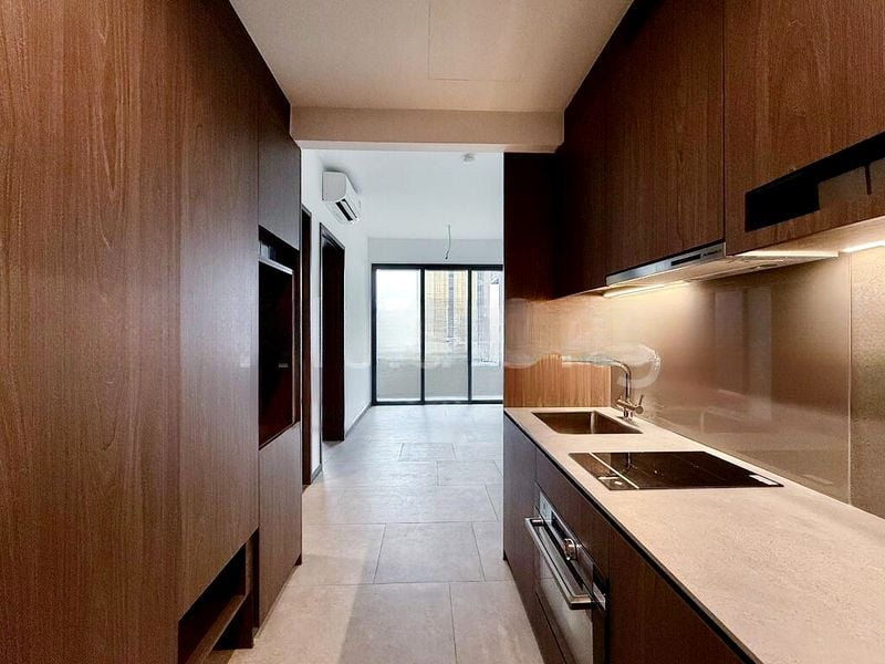 This thoughtfully designed 1-bedroom unit boasts a fully equipped kitchen with integrated appliances, including an induction cooktop and dark wood cabinetry that adds a touch of sophistication. The modern bathroom features a stylish vanity and wall-hung toilet, while the balcony offers a perfect spot to unwind and enjoy the urban landscape. Every detail has been carefully curated to enhance your living experience.
