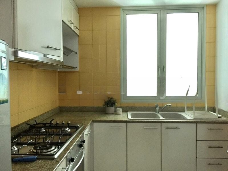 This well-maintained 3-bedroom, 2-bathroom condo features polished tile flooring throughout, enhancing the modern aesthetic. The open-concept dining area, adorned with geometric wall decor, seamlessly connects to the living room, which boasts a built-in TV console and easy access to the balcony. The galley kitchen is a chef's dream, equipped with two-tone cabinetry, a built-in oven, and a window for ventilation. Each bedroom offers ample space, with large windows providing plenty of light and character.