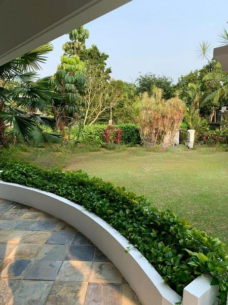 This spacious 5-bedroom, 5-bathroom unit boasts standout features including a modern wooden staircase with glass railings, an architectural bridge over the pool, and direct access to the pool area from the living room. The layout is perfect for both entertaining and family living, with ample space for relaxation and gatherings, enhanced by ceiling fans and bamboo roll-up blinds for added comfort.