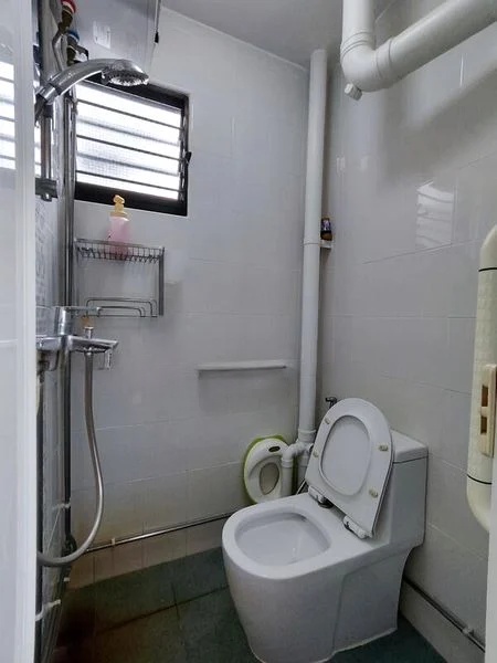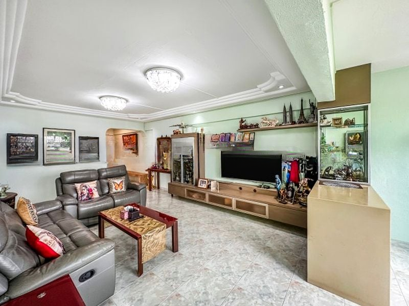 Step into a beautifully maintained HDB flat where traditional charm meets modern functionality. The spacious living area welcomes you with its tiled flooring and decorative ceiling moldings, complemented by crystal-style light fixtures that create a warm ambiance. Enjoy urban corridor views from the comfort of your leather sofa set, while built-in display cabinets add a touch of sophistication.