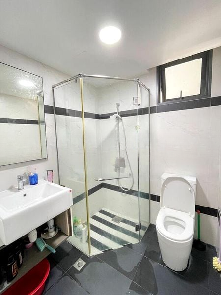 This well-maintained unit features an efficient layout with a mirrored kitchen backsplash that adds a touch of sophistication. The L-shaped kitchen is equipped with a gas hob and built-in oven, perfect for culinary enthusiasts. The master bedroom comfortably fits a queen bed and boasts a built-in wardrobe, while the second bedroom is ideal for a single bed and study setup. The bathrooms are modern, featuring glass shower enclosures and chic chrome fixtures.