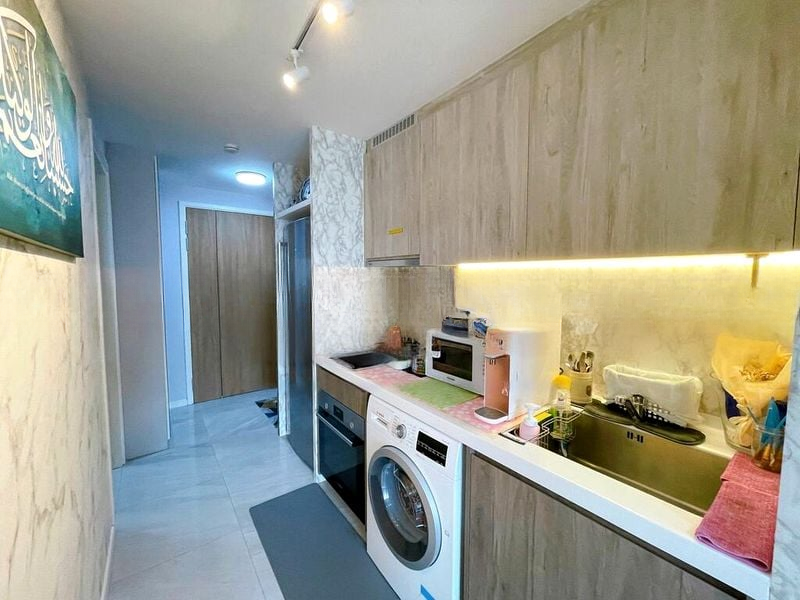 Step into this beautifully renovated unit at Uptown @ Farrer and be captivated by the modern ambiance and stunning views. The marble-patterned walls and natural light streaming through the zebra blinds create a warm and inviting atmosphere, while the unblocked urban skyline and greenery views provide a serene backdrop to your daily life.