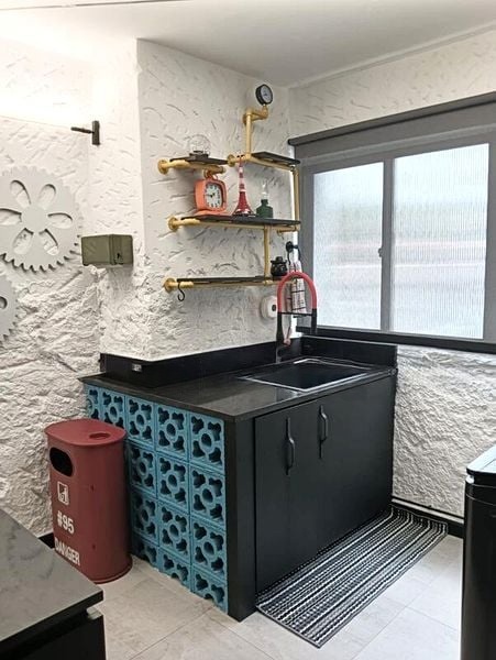 Step into a world of industrial chic where modern design meets functionality. The moment you enter this well-maintained unit, you are greeted by an ambiance that combines concrete-effect walls with striking industrial pipe fixtures and ambient LED lighting. The natural light filters through, highlighting the unique live-edge wood shelving and the eye-catching gear-themed wall decor, creating a space that feels both inviting and stylish.