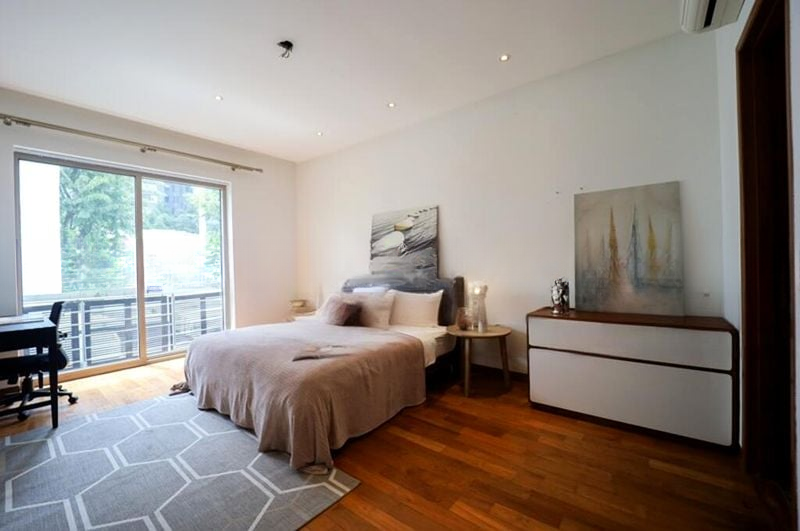 Step into this stunning 3-bedroom unit at Nassim Jade, where abundant natural light floods the open-concept living and dining area, creating a bright and airy ambiance. The polished wood flooring complements the modern finishes, while the large orange leather sectional sofa and designer gold arc floor lamp add a touch of elegance to your living space. Floor-to-ceiling curtains frame the large windows, enhancing the inviting atmosphere.